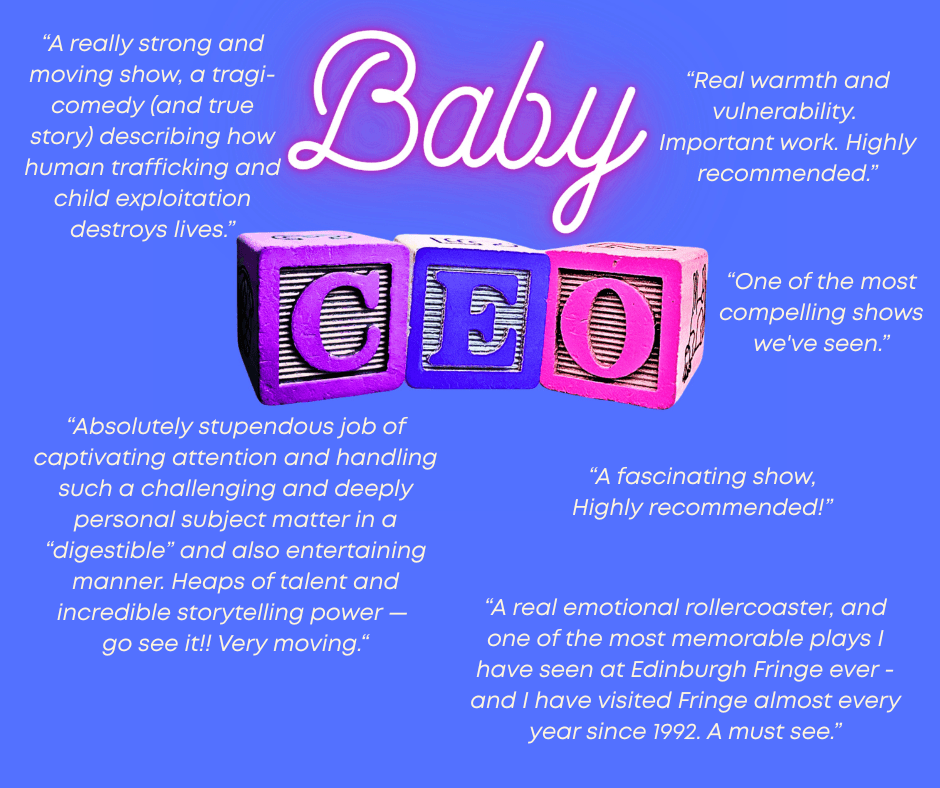 Baby CEO is a true crime comedy about human trafficking, identity theft, cults, child actors, and the tragicomic omen of being born on the set of a Coen brothers movie to a mafia family. Written and performed by “retired” child actor, journalist, and child trafficking survivor, Sabra Boyd has returned to the stage – this time on her own terms to tell her story.